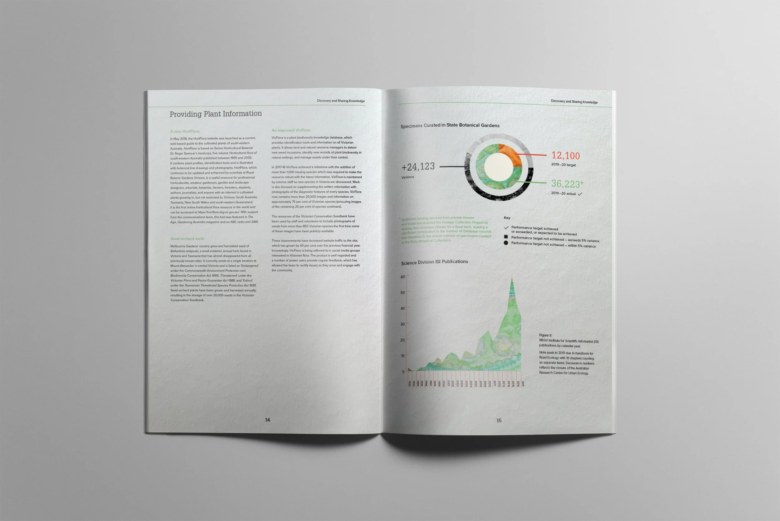 A functional and creative redesign for an annual report from The Royal Botanic Gardens Victoria. Let’s dive into the world of the cell, the publication features two typefaces, watercolour imagery and a flexible grid system to put it all together. In relation to RGBV’s cellular research (Phylogeography), these watercolour images represent plant cell structures with many different abstract shapes, patterns and colours